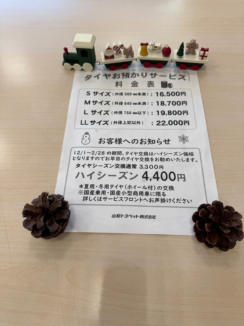 12月1日からはタイヤ交換がハイシーズン価格とりますので、よろしくお願いいたします。